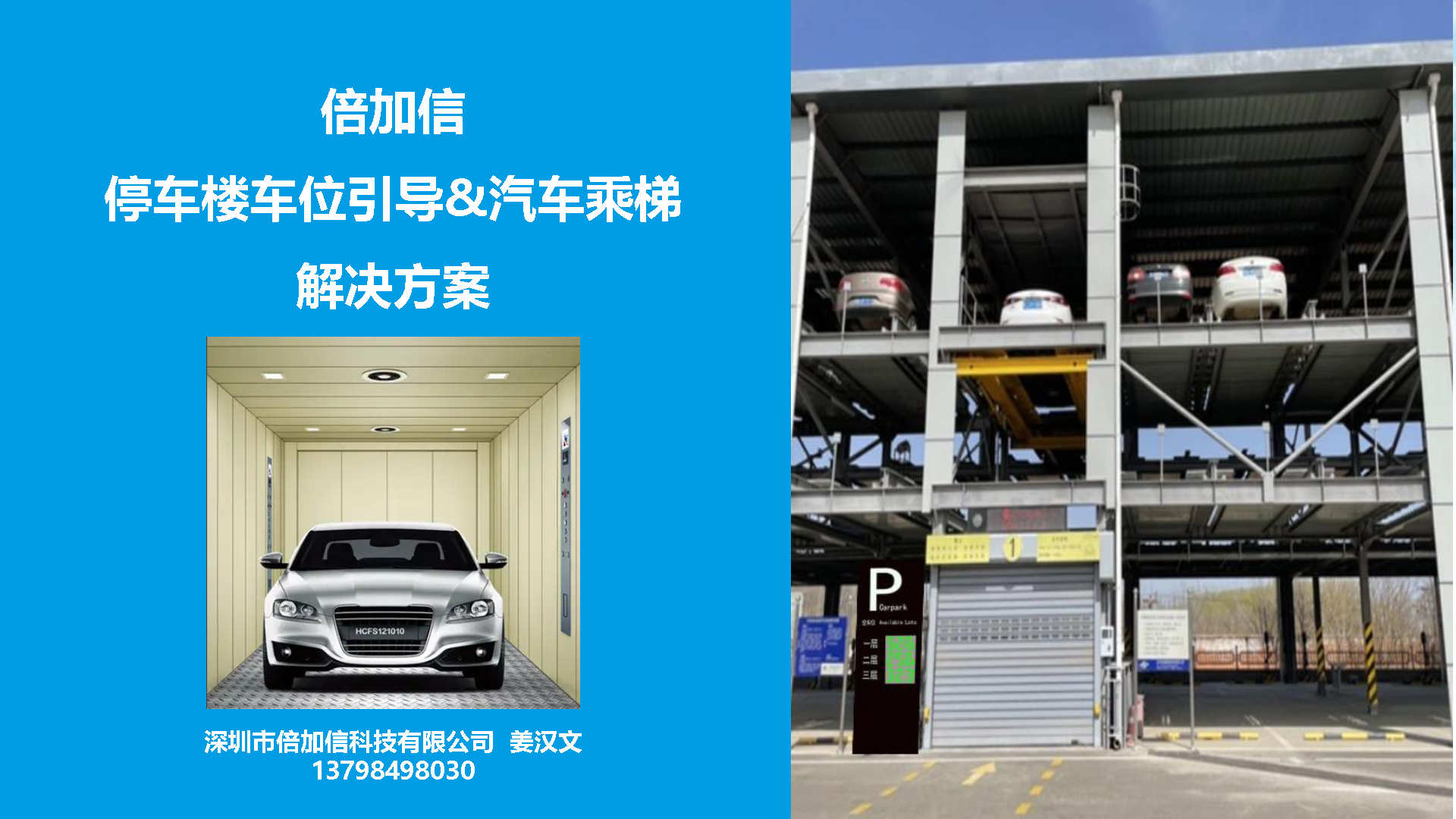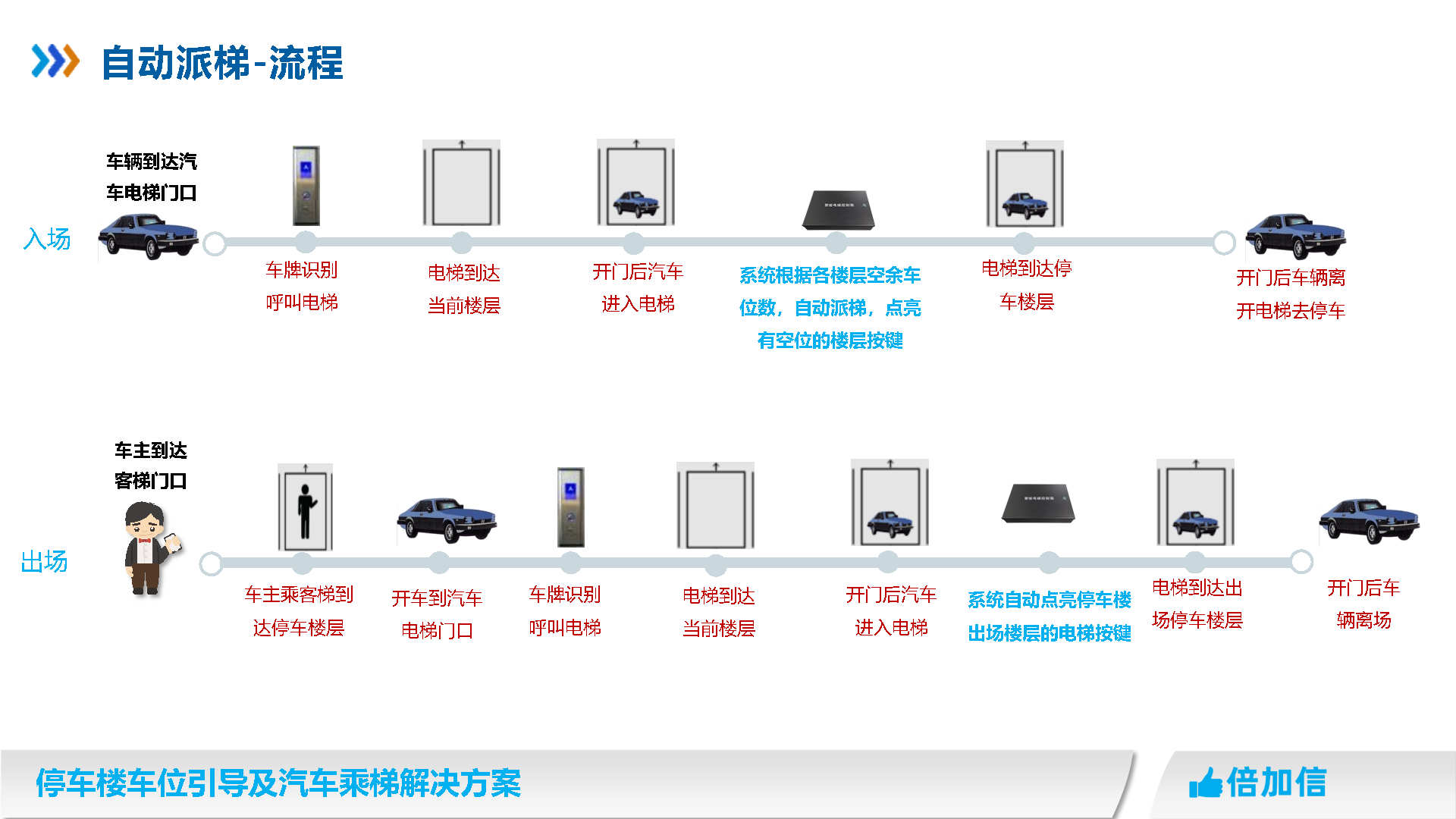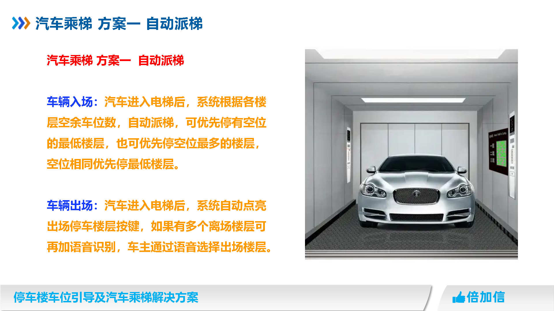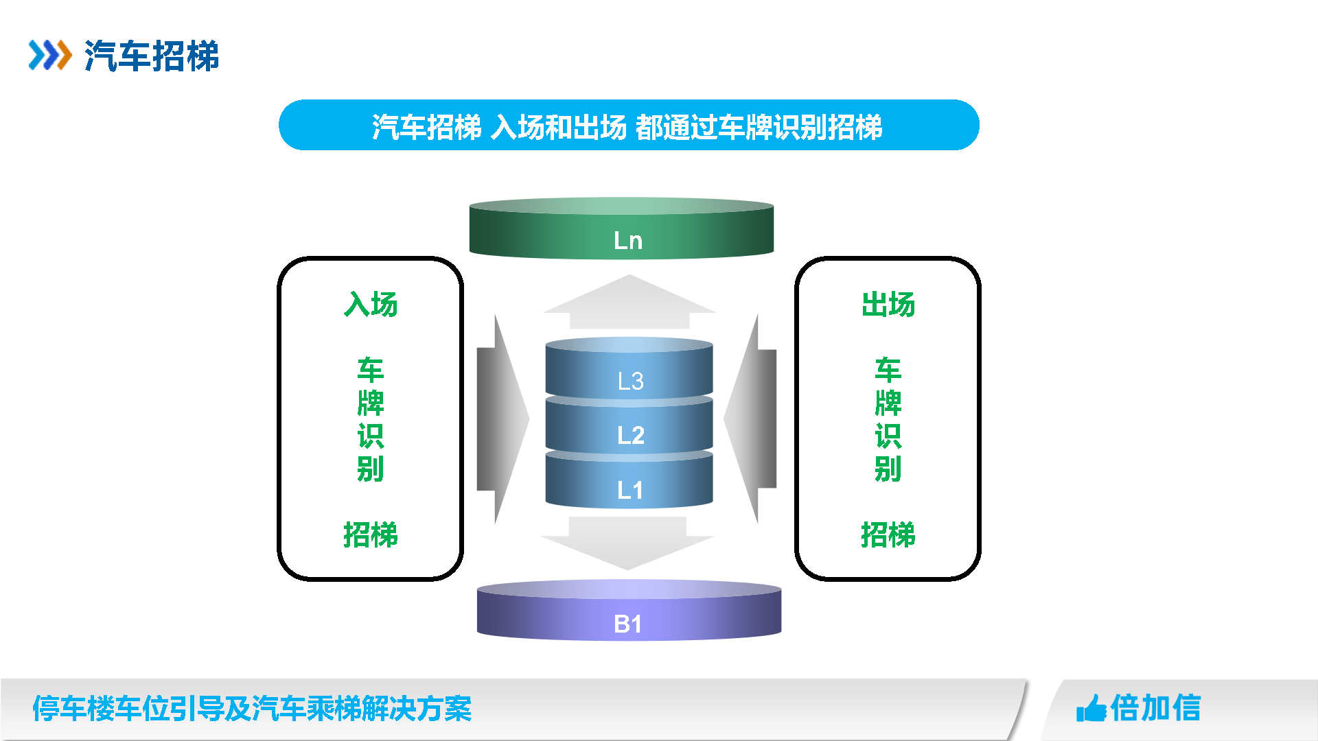 倍加信汽車乘梯系統方案優勢 1、通過視頻/超聲波/地磁,實時獲取停車樓各樓層空余車位數/ 2、入庫電梯屏、電梯橋箱屏、分區引導屏實時引導車主停車 3、車牌識別自動呼叫電梯到達當前樓層,包括入場乘梯和離場乘梯 4、不需要電梯提供協議,汽車派梯系統可自動根據各樓層空余車位數,自動派梯 5、不需要電梯提供協議,可實時獲取電梯當前停靠樓層、電梯上下行狀態、開關門狀態 6、不需要電梯提供協議,可語音識別招梯和乘梯,包括客梯也可以語音乘梯 7、不需要電梯提供協議,可實現汽車電梯禁止人員乘梯,包括內呼和外呼都禁止 8、可自動派梯和語音乘梯組合使用,特別是離場樓層有多層情況車主可自己選擇樓層 9、汽車乘梯過程可禁止其他汽車招梯,防止電梯未到達指定樓層就停靠 10、可在電梯門口增加紅綠指示燈,顯示當前汽車電梯是可用或正在使用狀態 11、電梯提供協議,也可以與電梯協議對接實現上面所有功能