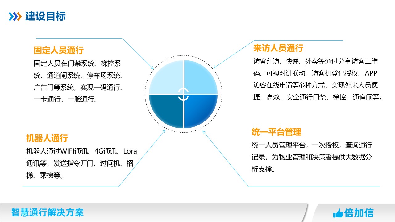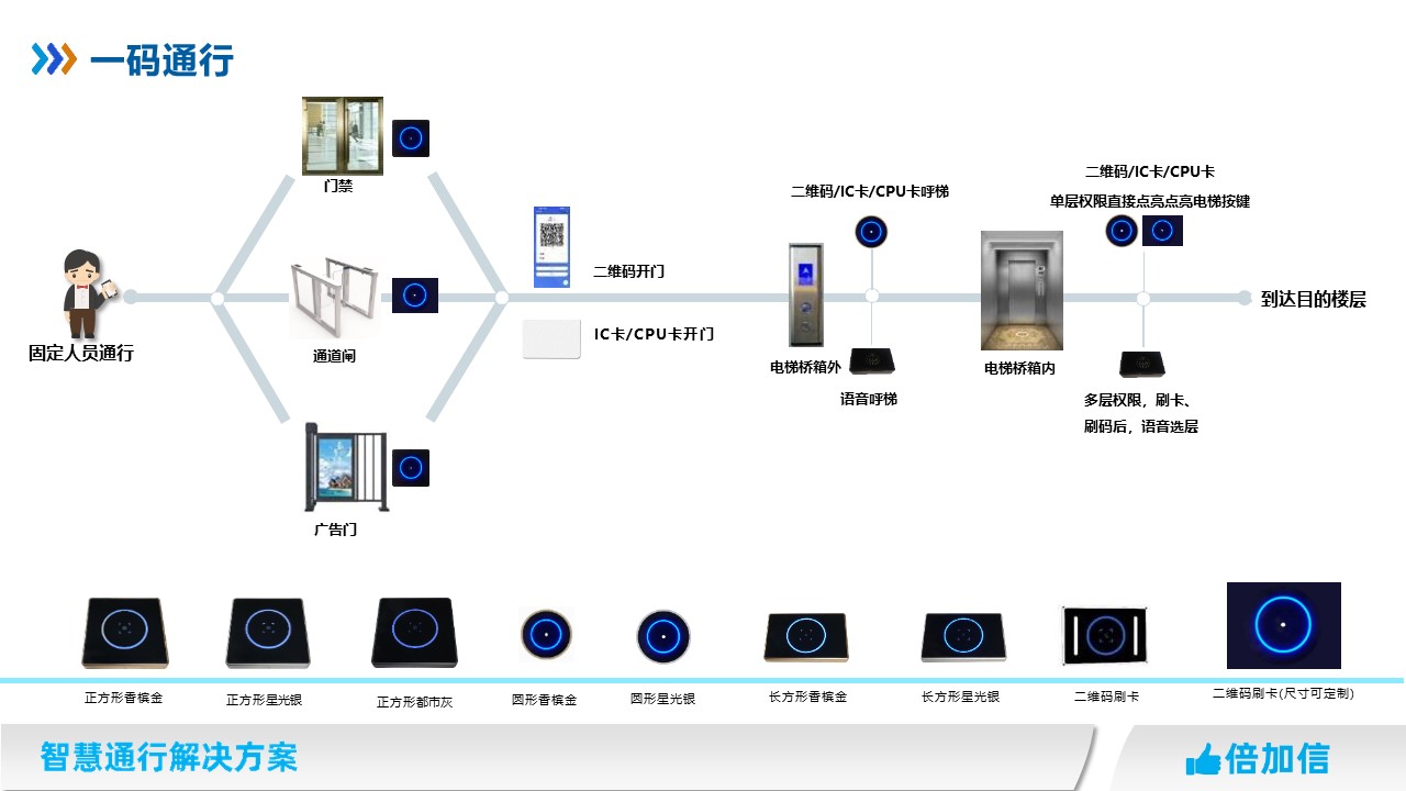固定人員在門禁系統、梯控系統、通道閘系統、停車場系統、廣告門等系統,實現一碼通行、一卡通行、一臉通行。