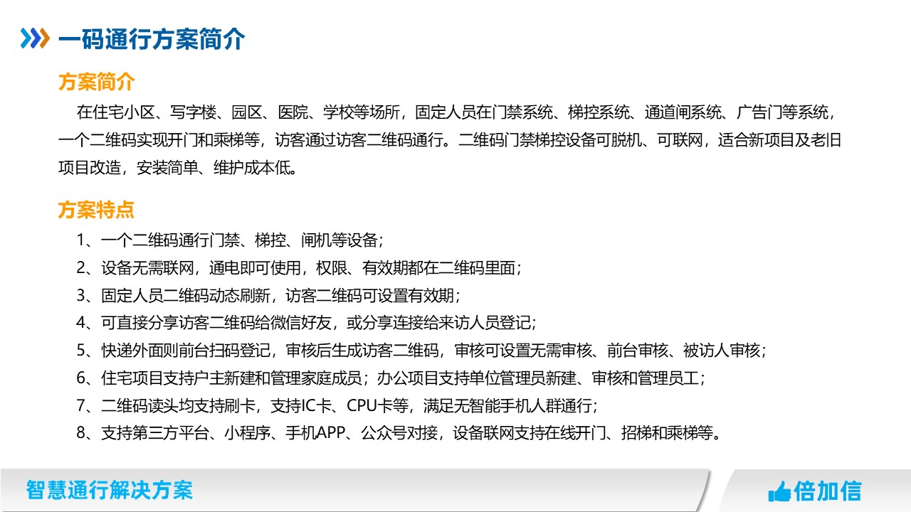 在住宅小區、寫字樓、園區、醫院、學校等場所,固定人員在門禁系統、梯控系統、通道閘系統、廣告門等系統,一個二維碼實現開門和乘梯等,訪客通過訪客二維碼通行。二維碼門禁梯控設備可脫機、可聯網,適合新項目及老舊項目改造,安裝簡單、維護成本低。