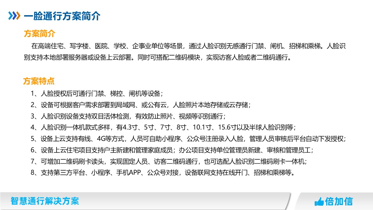 在高端住宅、寫字樓、醫院、學校、企事業單位等場景,通過人臉識別無感通行門禁、閘機、招梯和乘梯。人臉識別支持本地部署服務器或設備上云部署。同時可搭配二維碼模塊,實現訪客人臉或者二維碼通行。