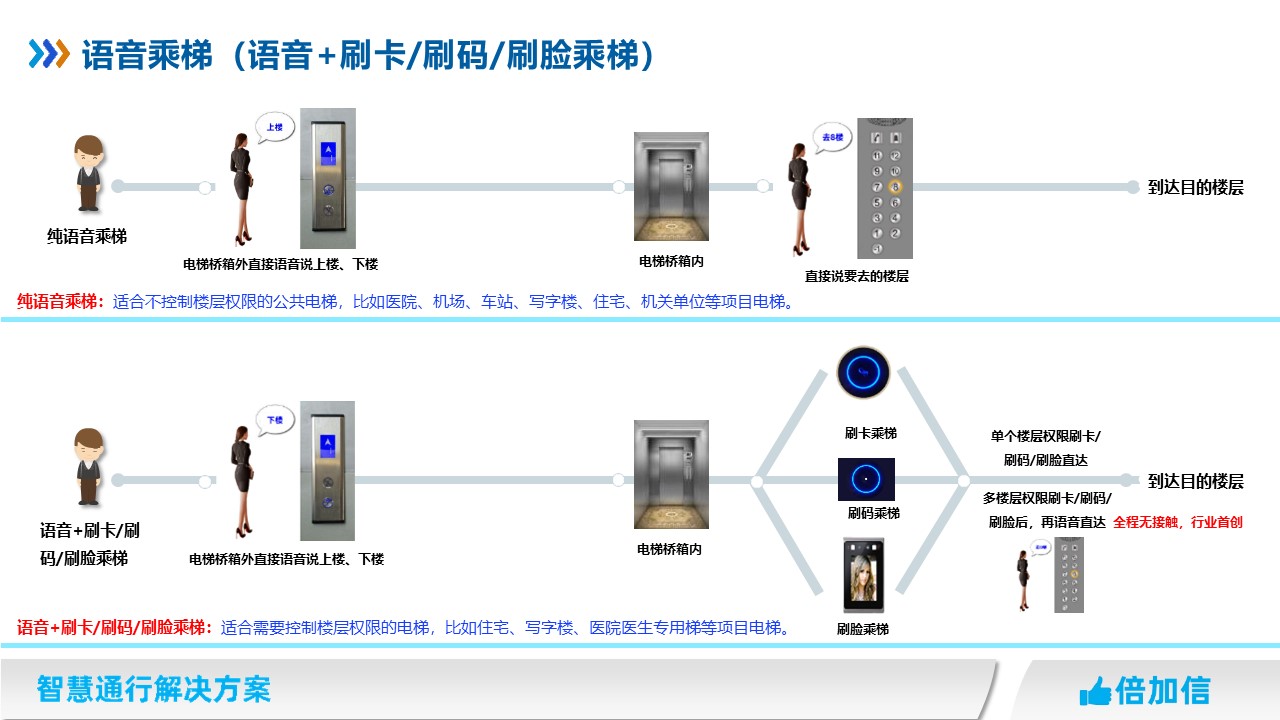 倍加信科技作為專業(yè)的梯控系統(tǒng)研發(fā)廠家,推出真正零接觸的乘梯方案。不判斷樓層權(quán)限,全程通過語音識別實現(xiàn)呼梯和乘梯。