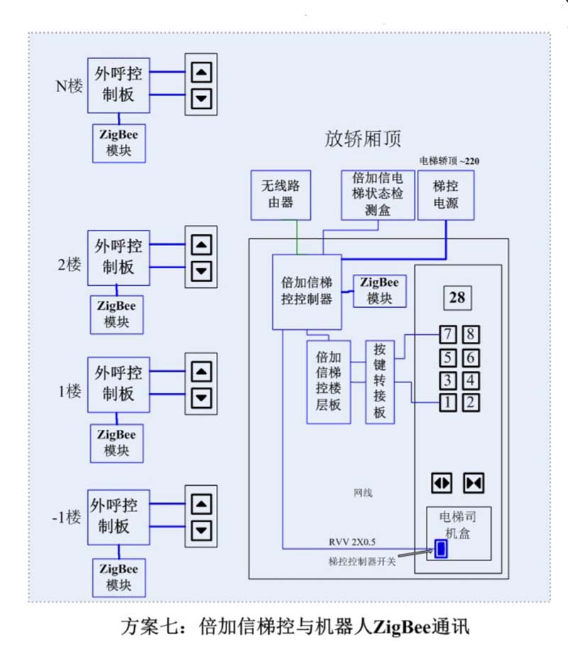 (1)機器人在電梯外,通過ZigBee通訊發送指令倍加信梯控系統,系統自動點亮上樓或下樓按鍵,實現呼梯功能。