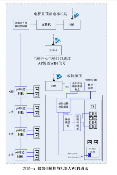 1. 機器人乘梯系統的組成:這個系統主要由梯控主控制箱、電梯內呼按鈕控制、電梯樓層檢測、電梯門檢測、倍 加·信IC卡二維碼復合讀頭(可選)和TCP/485轉換器等五部分組成。其中,主控制箱含有主控制板和系統電源,負責系統的邏輯和控制中心的功能以及為系統供電;樓層檢測器用于檢測電梯當前的樓層和上下行狀態;開門監測器則用于監測轎箱門的開關狀態;內呼按鈕控制根據主控制器的指令進行樓層選擇和樓層開放控制;TCP/485轉換器負責進行通信方式的轉換,并負責主控制系統與后臺云平臺的命令與數據的傳輸。