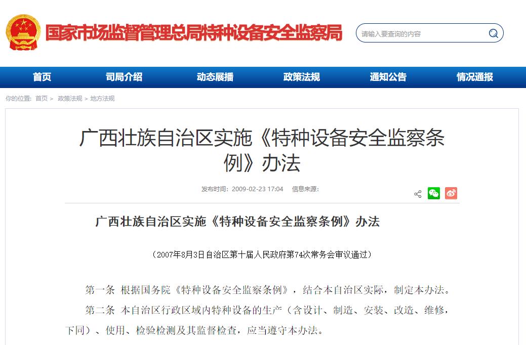 《廣西壯族自治區特種設備安全監察條例》2007年8月3日自治區第十屆人民政府第74次常務會審議通過
